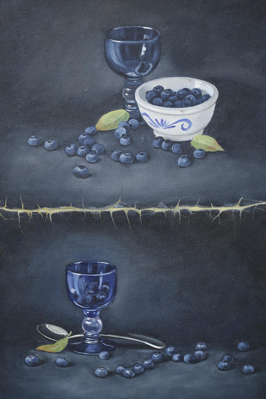 20th century blue glass and berry still life painting