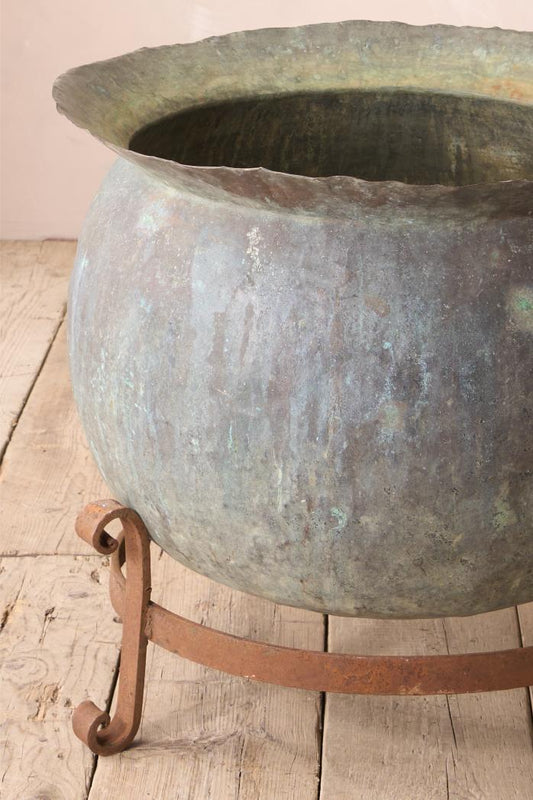Large 19th century verdigris copper vat on iron stand