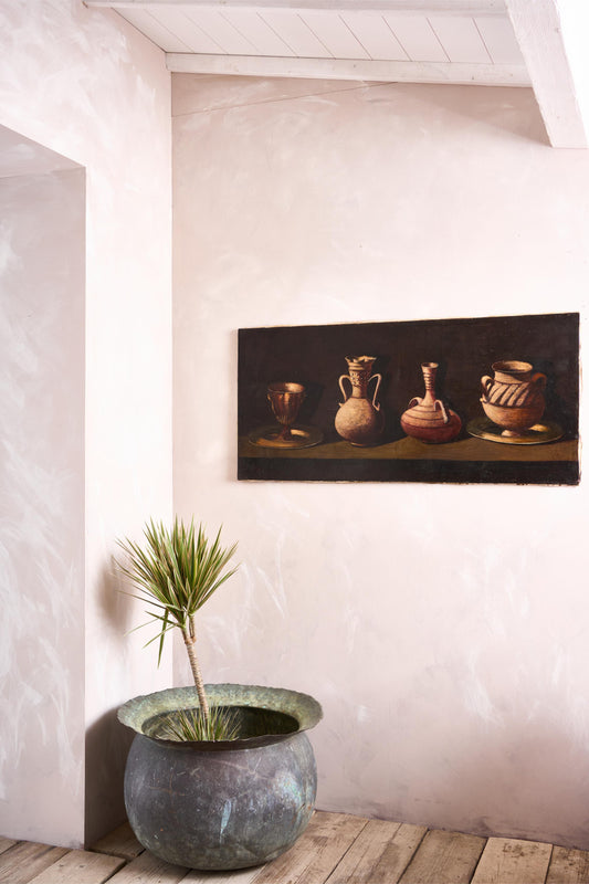 Large 20th century oil on canvas painting of 4 pots