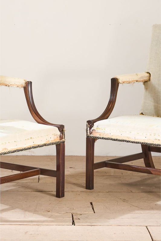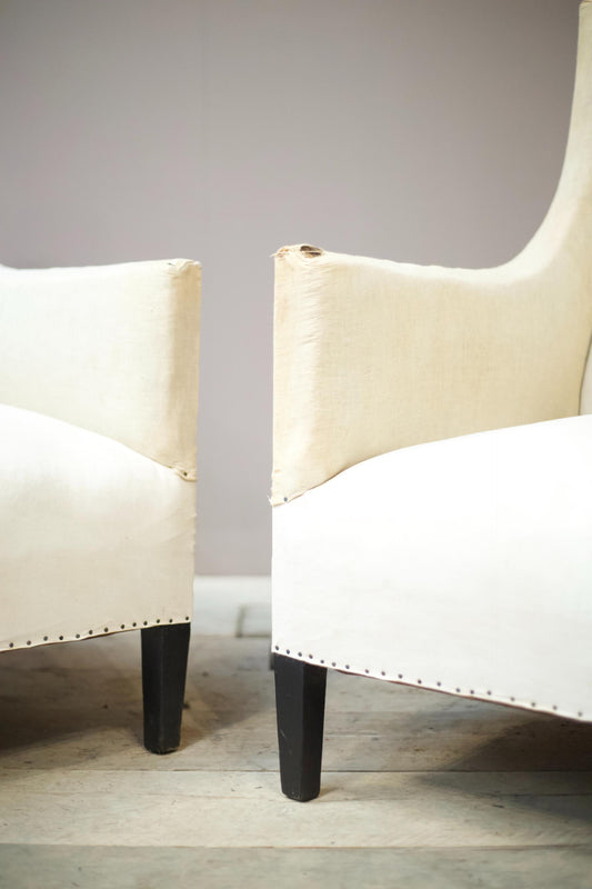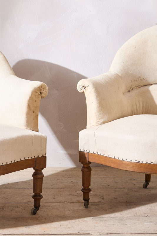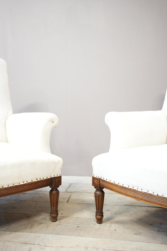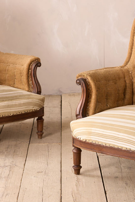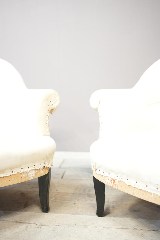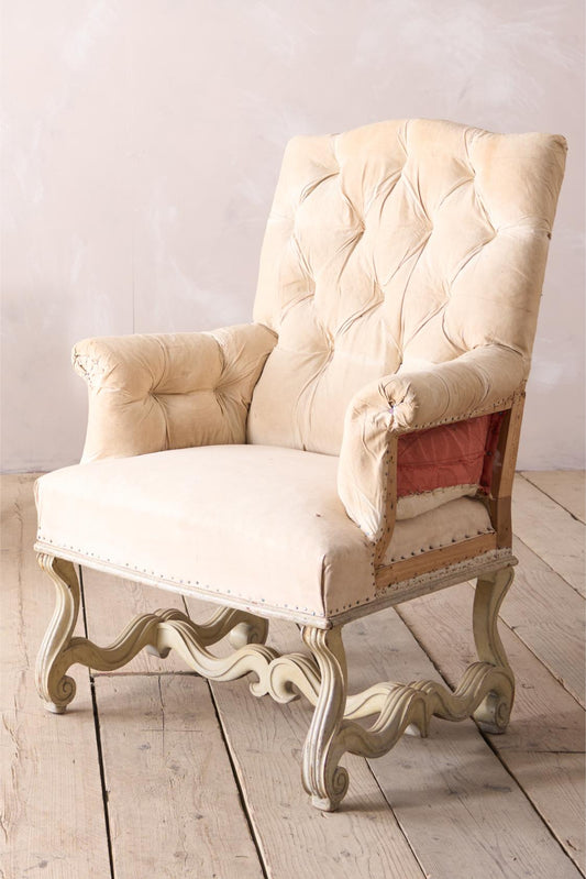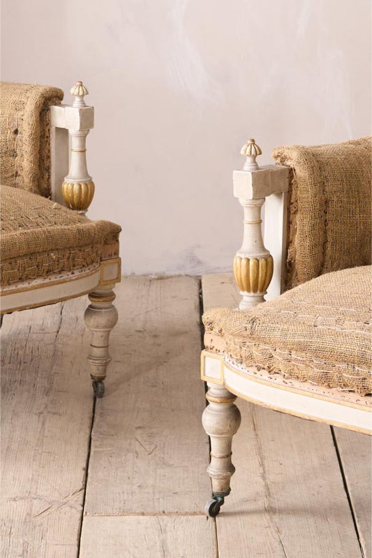 Pair of 19th century French buttoned back armchairs with painted carved frame