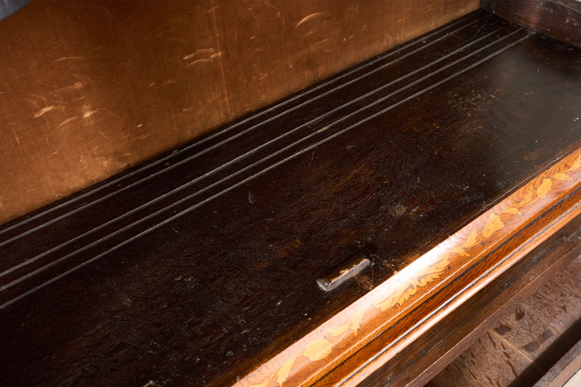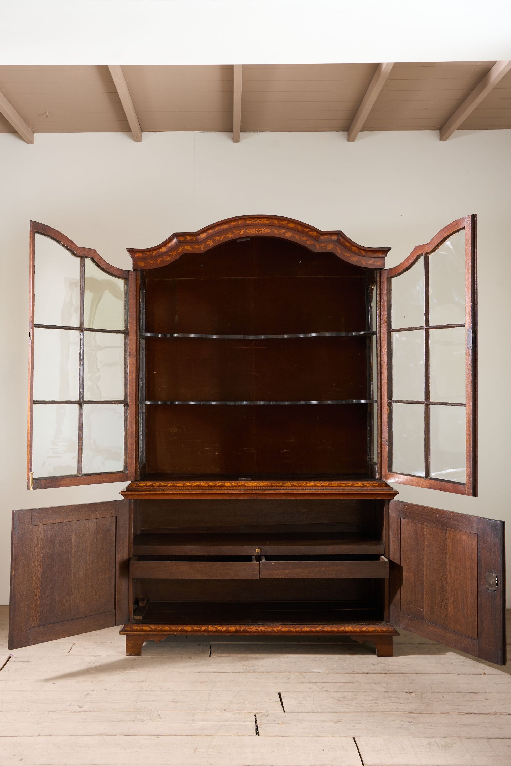 This is a fabulous quality, all original 18th century Dutch cabinet. The marquetry inlay in exceptional and makes this stand out in any interior. The thin glass in the top half again all original and has the tell tale signs of bubbling and waviness consistent with antique glass thats just beautiful. The top cabinet opens and locks well and contains two shelves ideal for plates, books or trinkets. The base is lightly faded in parts but nothing that takes away from the piece. Behind the cupboard doors is a shelved interior complete with two hidden oak drawers that are a lovely detail.