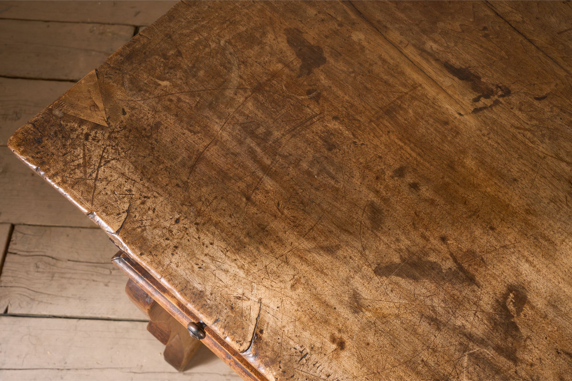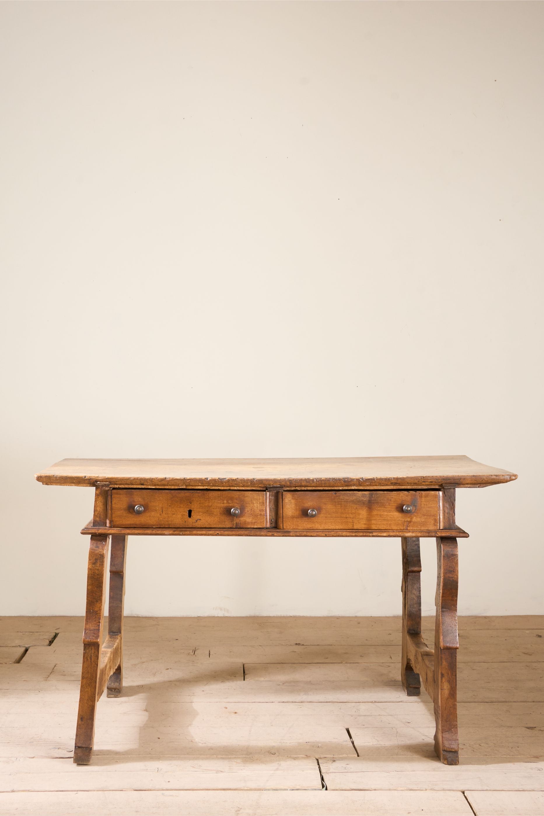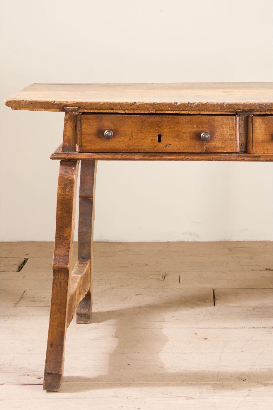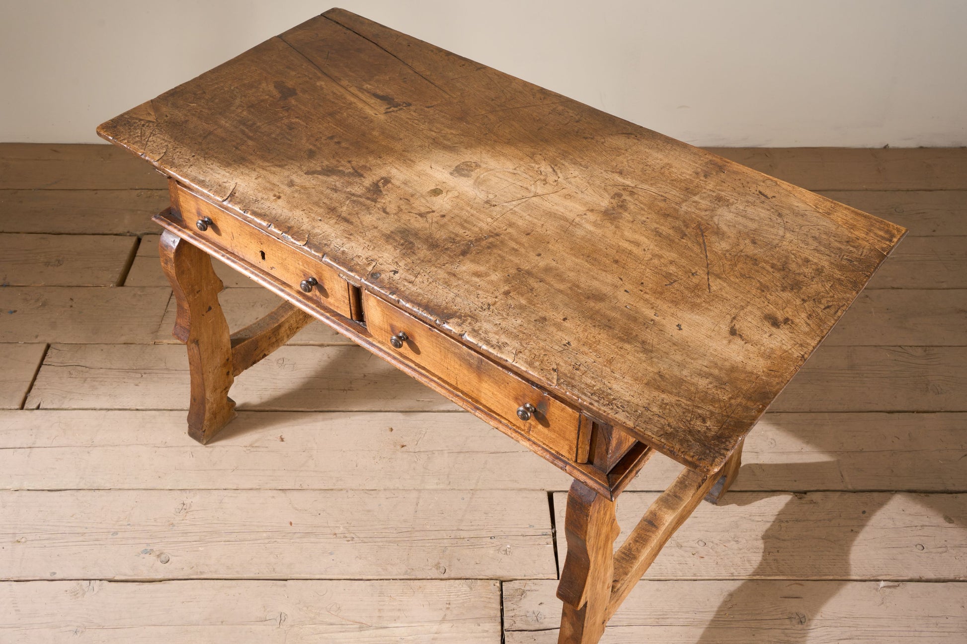 This is a very characterful 18th century Spanish table. It is made from walnut throughout and the top is a stunning single plank that has a wonderful patina and tactile feel that can only be achieved by being a well loved piece of furniture for over 200 years. The whole table is charming and its the quirks that give it the real decorative merits. The whole piece is solid and sits stable. Perfectly useable and the two drawers also open and close easily. The handles are metal which is a nice quality touch but for me the top and the character of the legs is what makes this table fabulous. Honest old repairs throughout and all treated for wood worm.