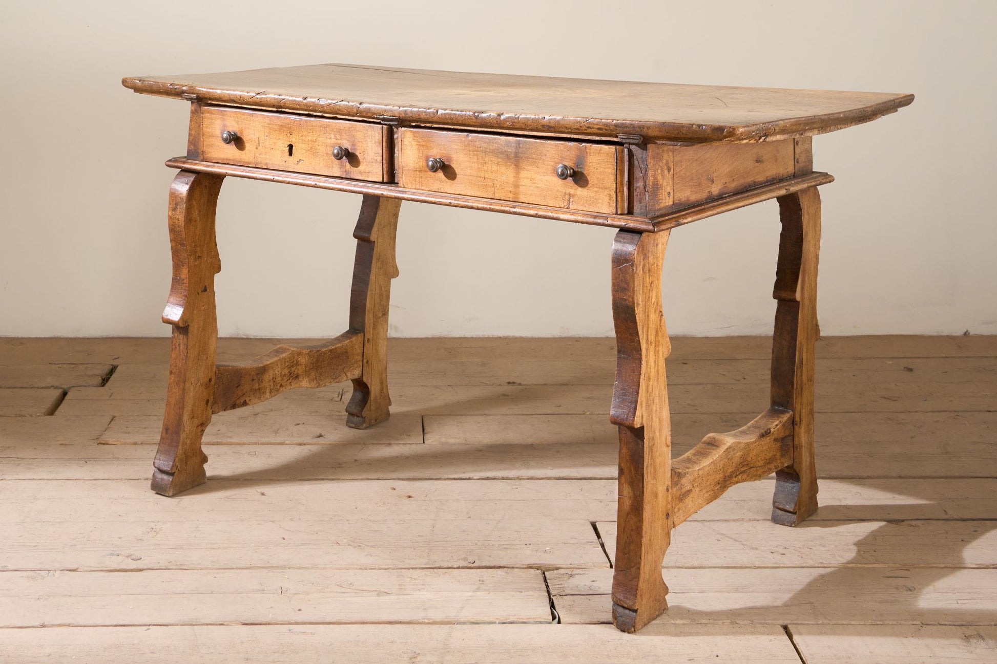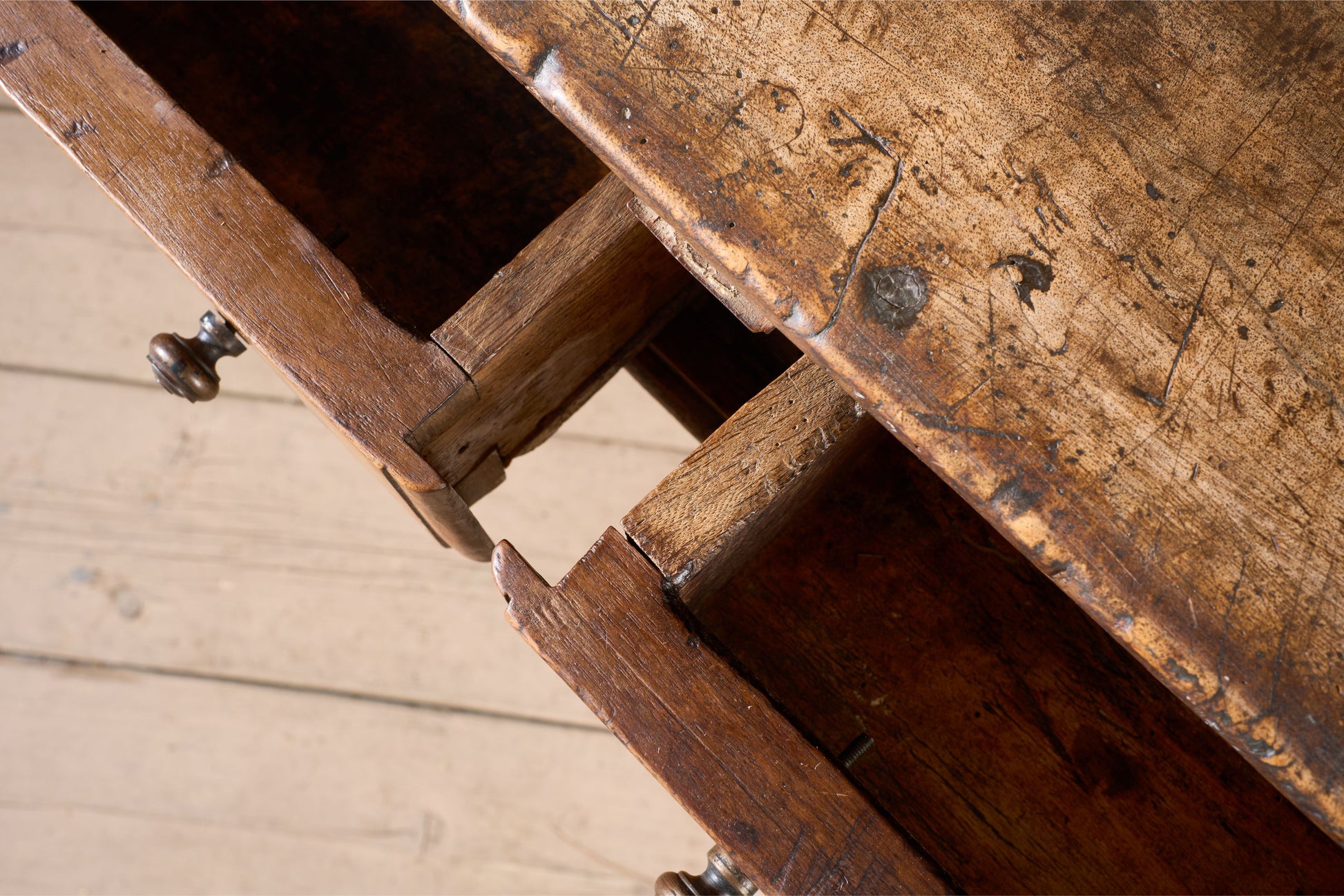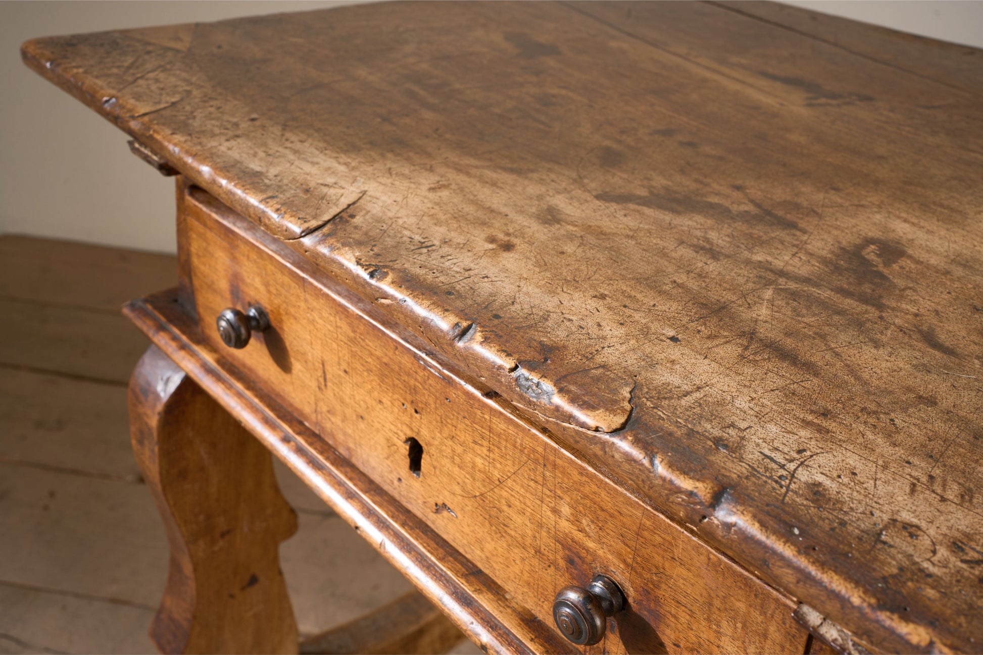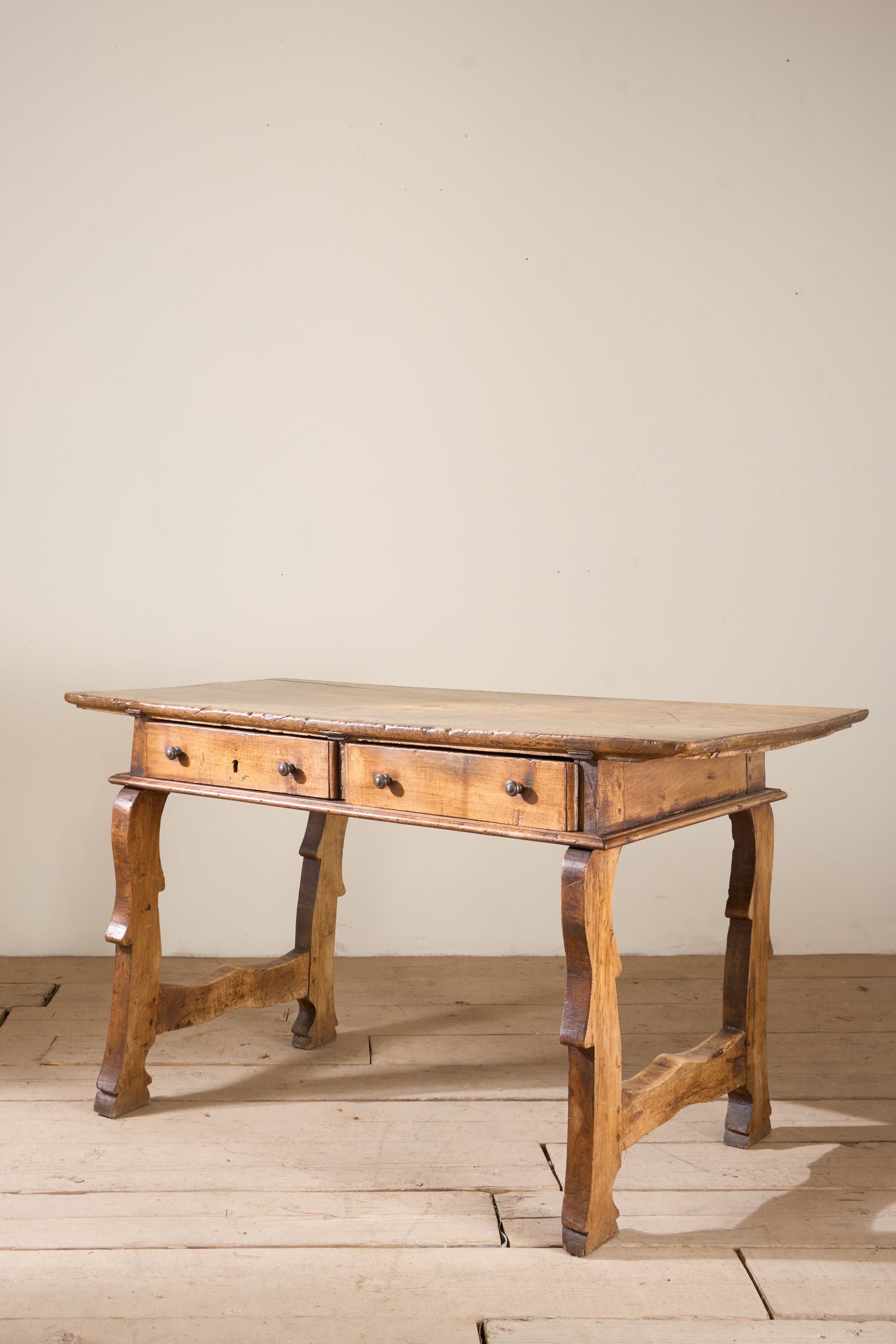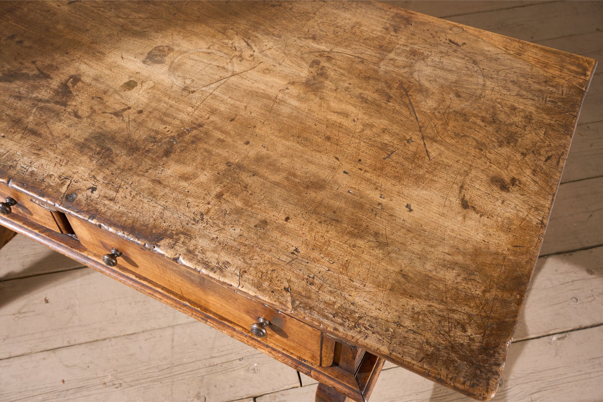 This is a very characterful 18th century Spanish table. It is made from walnut throughout and the top is a stunning single plank that has a wonderful patina and tactile feel that can only be achieved by being a well loved piece of furniture for over 200 years. The whole table is charming and its the quirks that give it the real decorative merits. The whole piece is solid and sits stable. Perfectly useable and the two drawers also open and close easily. The handles are metal which is a nice quality touch but for me the top and the character of the legs is what makes this table fabulous. Honest old repairs throughout and all treated for wood worm.