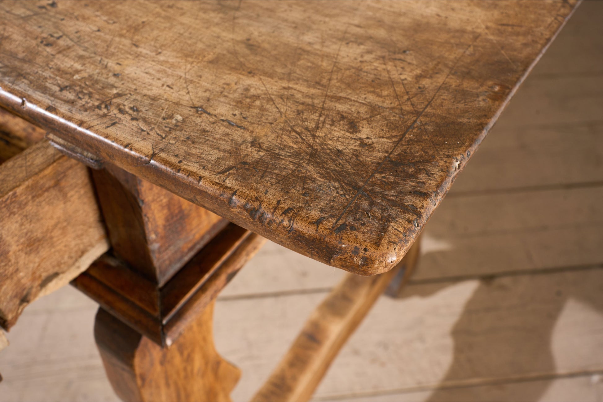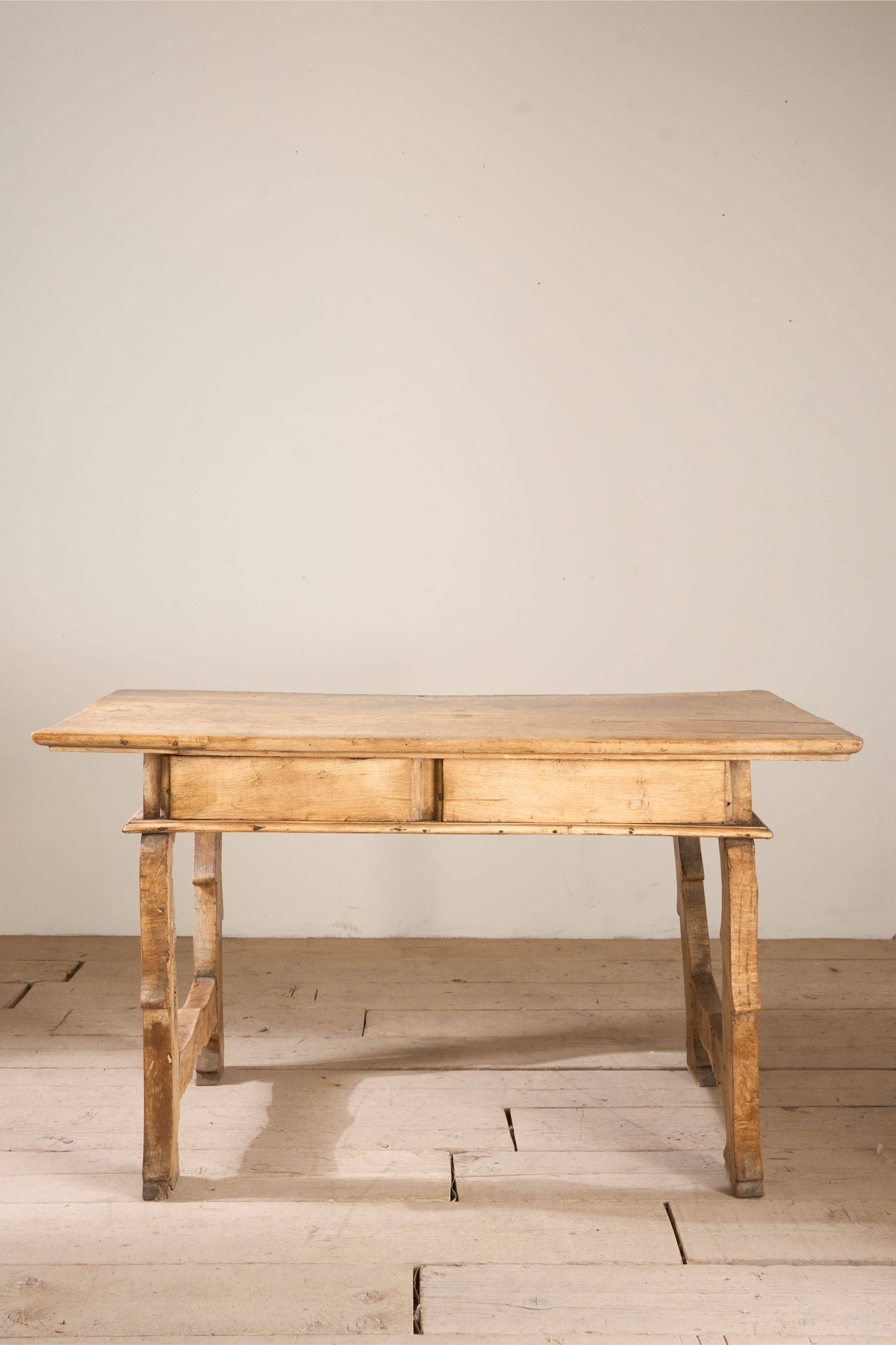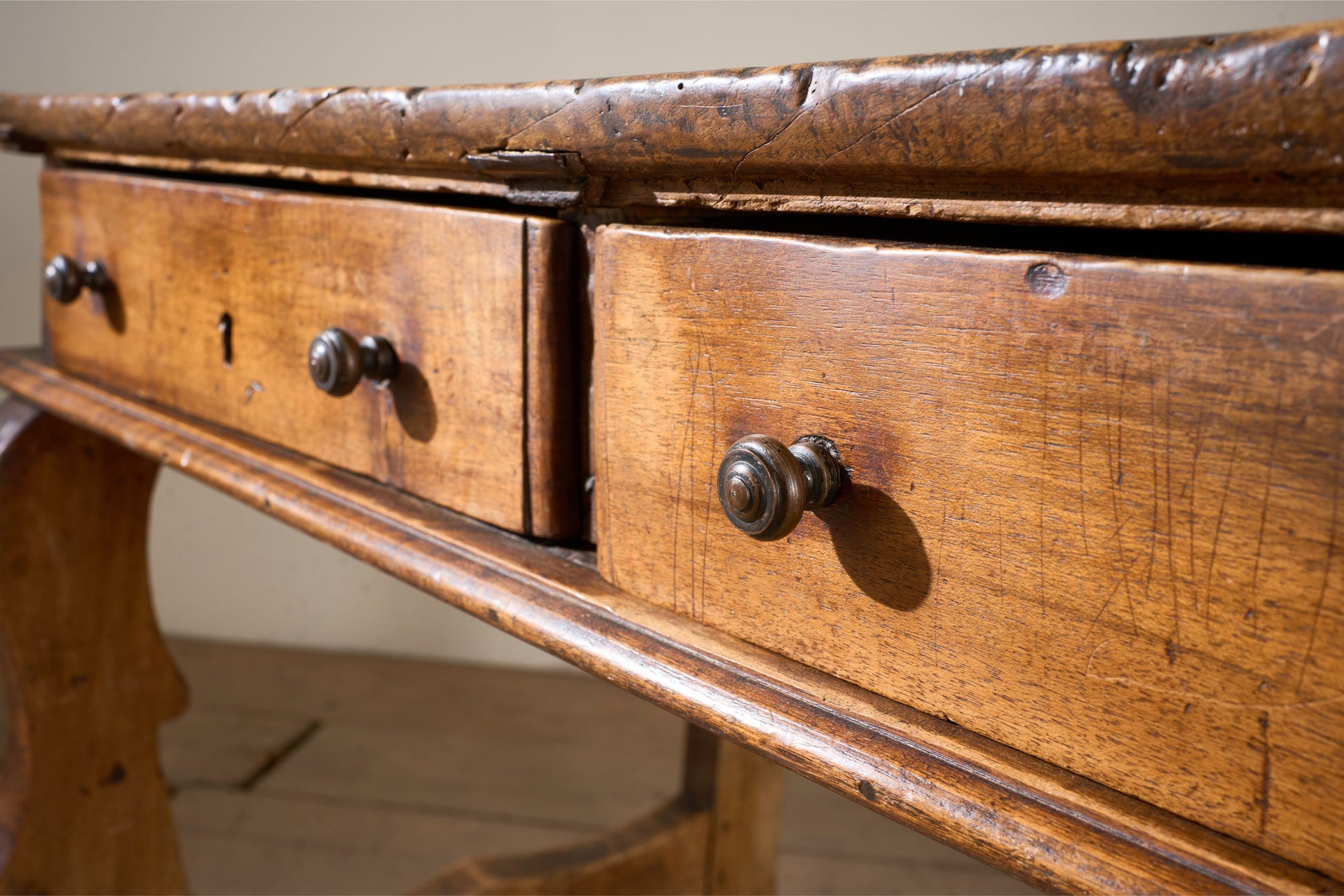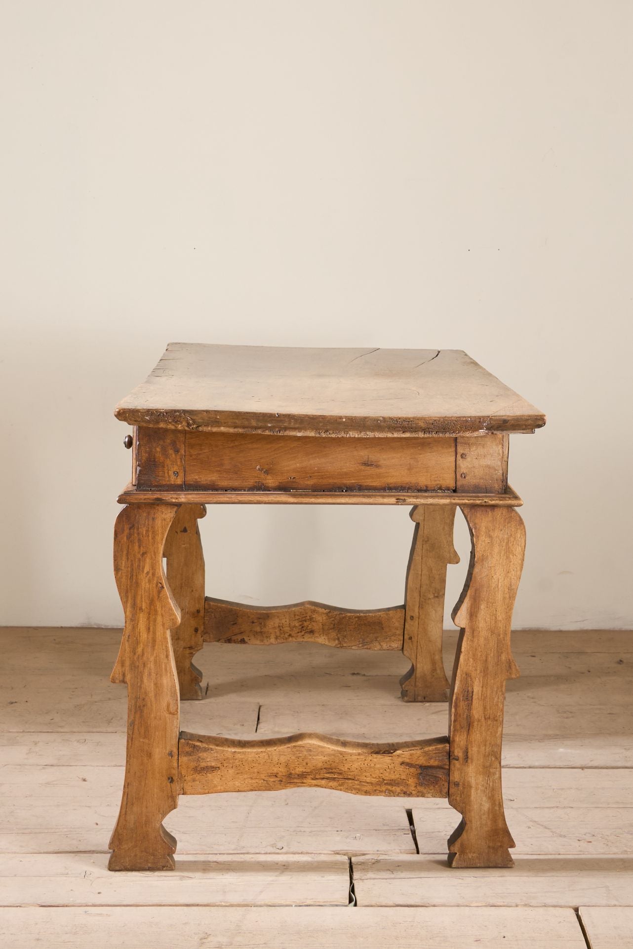 This is a very characterful 18th century Spanish table. It is made from walnut throughout and the top is a stunning single plank that has a wonderful patina and tactile feel that can only be achieved by being a well loved piece of furniture for over 200 years. The whole table is charming and its the quirks that give it the real decorative merits. The whole piece is solid and sits stable. Perfectly useable and the two drawers also open and close easily. The handles are metal which is a nice quality touch but for me the top and the character of the legs is what makes this table fabulous. Honest old repairs throughout and all treated for wood worm.