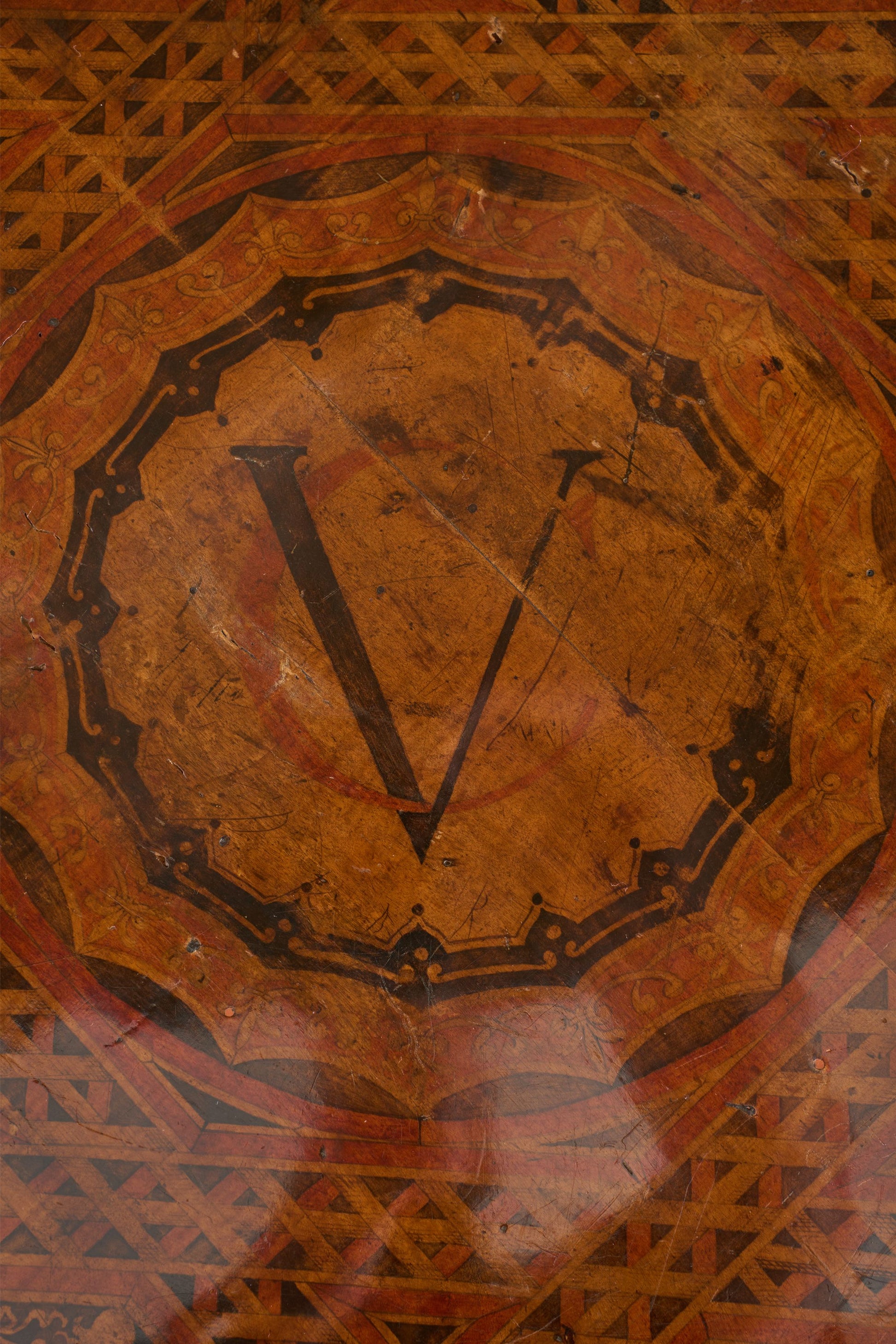 This is a very unusual occasional table that is 19th century in age with a striking ebonised turned base and highly decorated top. This gives the feel of masonic furniture and has CV painted into a crest. Overall condition is good with historic repairs to the base but all solid and the top is clear of any significant damage. A very curious piece.