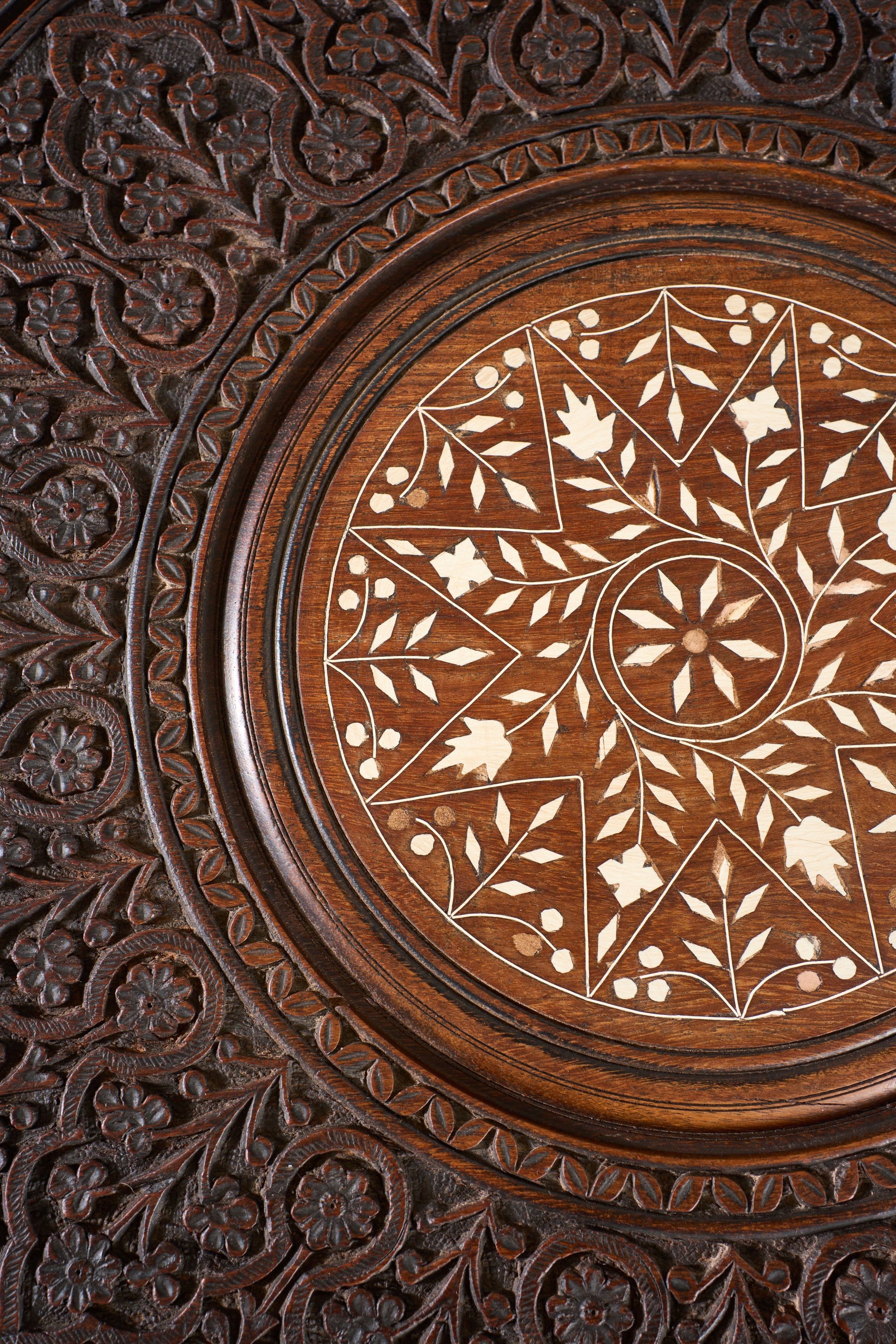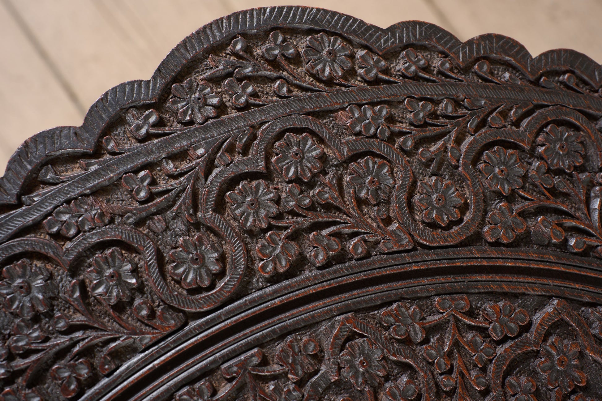 This is a very nice quality, totally original 19th century Padauk Anglo-Indian side table. The finely carved top is exceptional quality with the striking bone inlaid centre circle contrast. The base us also very nicely carved and overall is in wonderful condition with no significant losses or damage often found with this style of furniture.