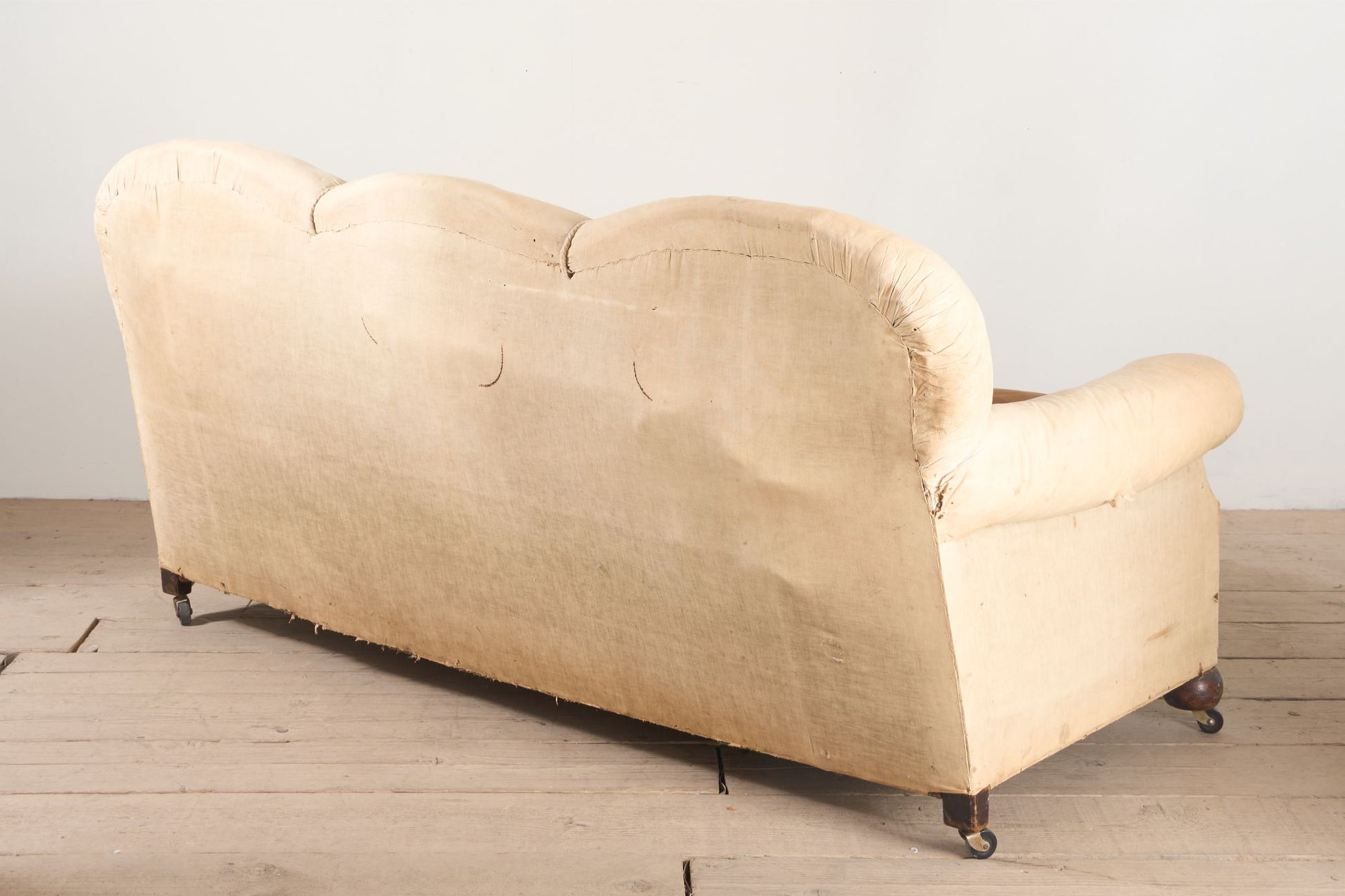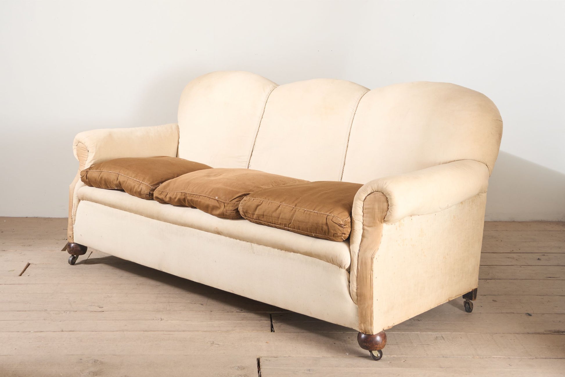 This is a very nice high quality early 20th century country house sofa with a wonderful scalloped back design. The size of the sofa is very impressive and sits on bun feet. The depth of seat makes it extremely comfy and the seat cushions will be replaced with new feather during upholstery.