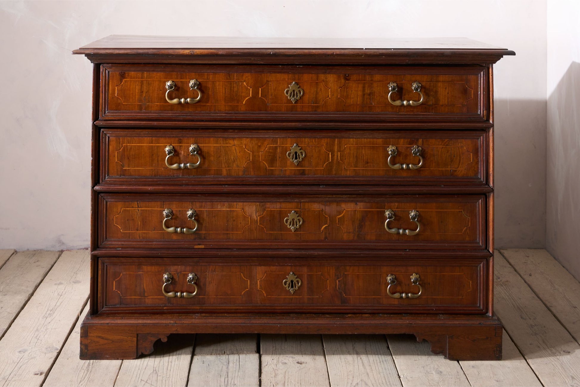This is an exceptional set of 18th century Italian chest of drawers. Made from walnut with a huge amount of strung details that covers the front, top and sides. The quality is very high and all looks to be original as far as I can see. The scale of the piece is fabulous and is guaranteed to make a statement in any room it is put into. Heavy brass drawer handles which suit the scale of the piece perfectly. The overall condition is very good and shows its age handsomely. The drawers all shut flush as well.