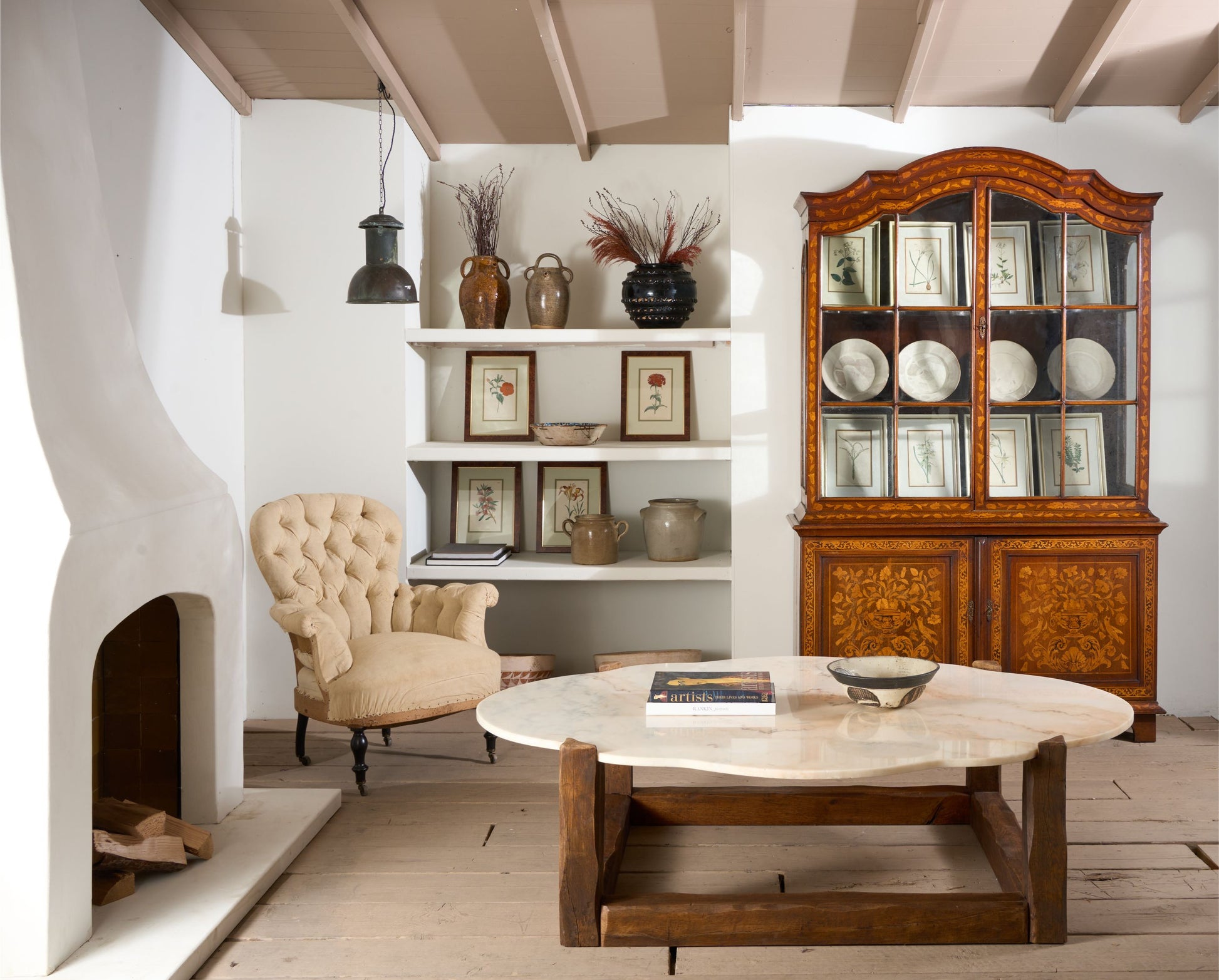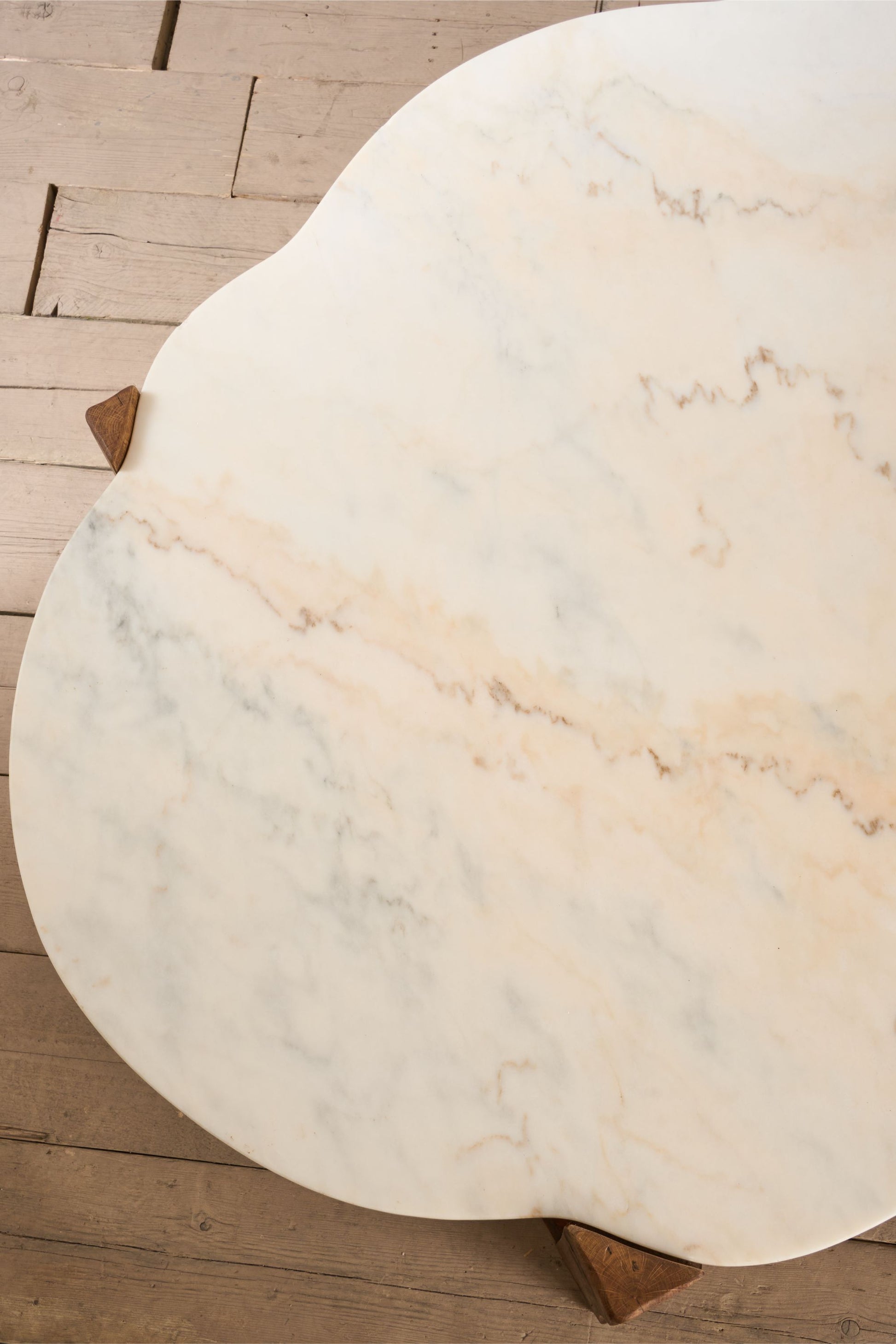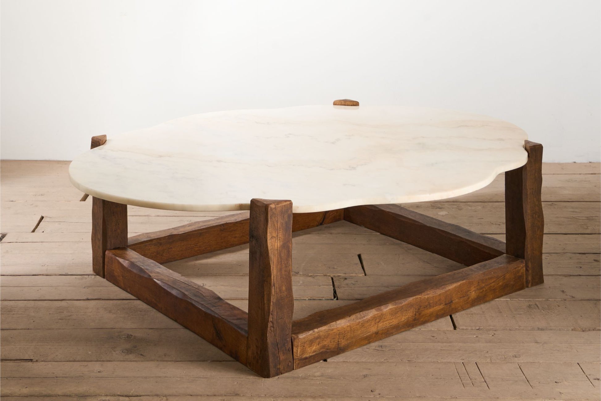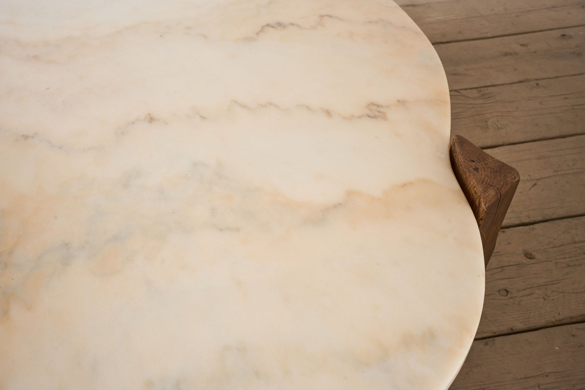 This is a simply fabulous mid 20th century oak and polished stone coffee table. French in origin and a striking design. The stone is in a cloud shape with a beautifully smooth finish. The base is solid oak and has shaped support that fit into the curves of the stone neatly. The contrast of materials and the organic nature of the base really makes this a statement piece in any home. The stone has a few small old nibbles but nothing that takes away from the piece.