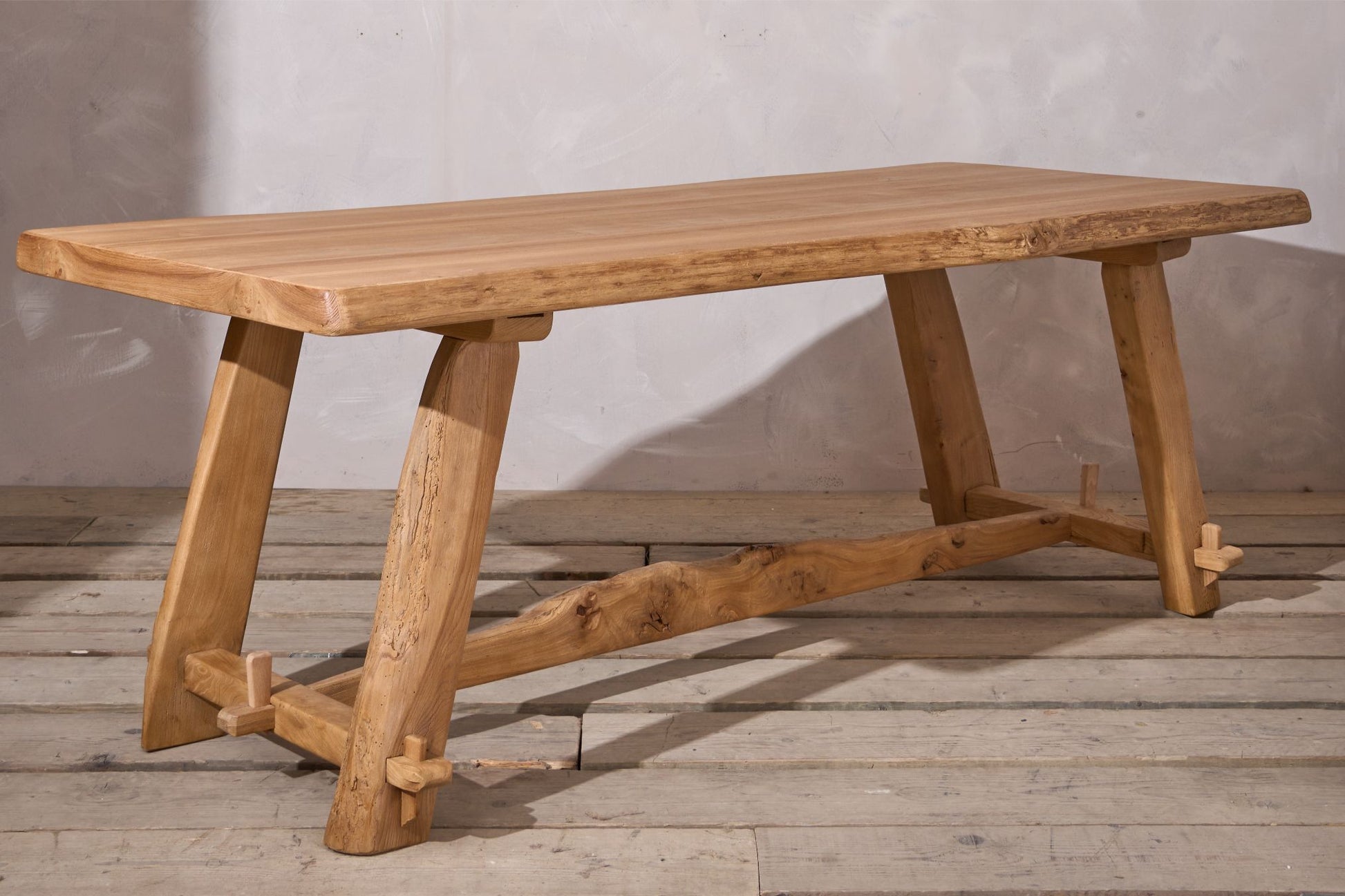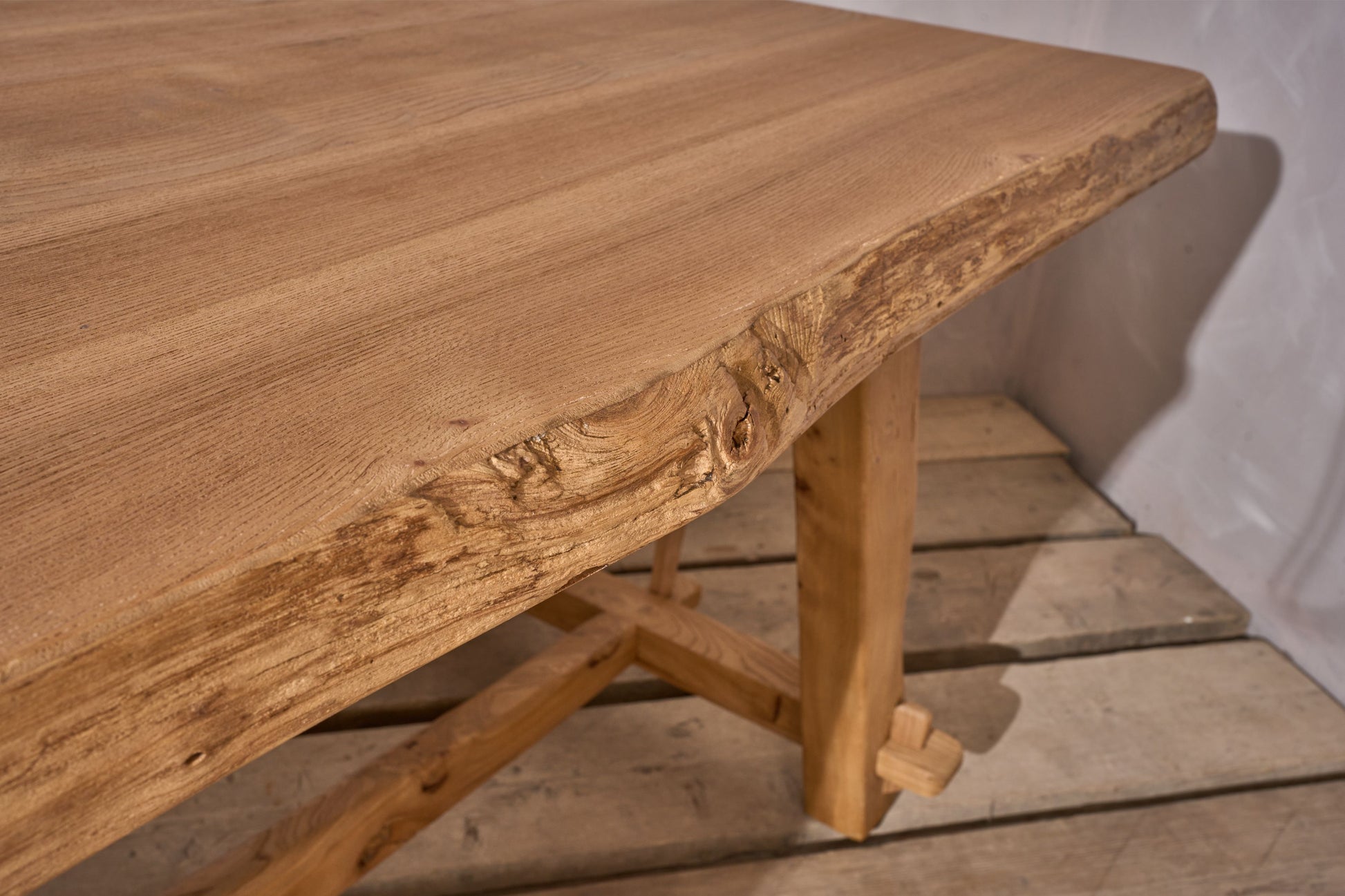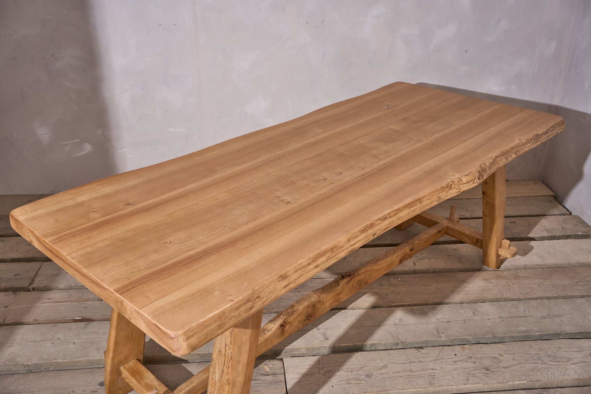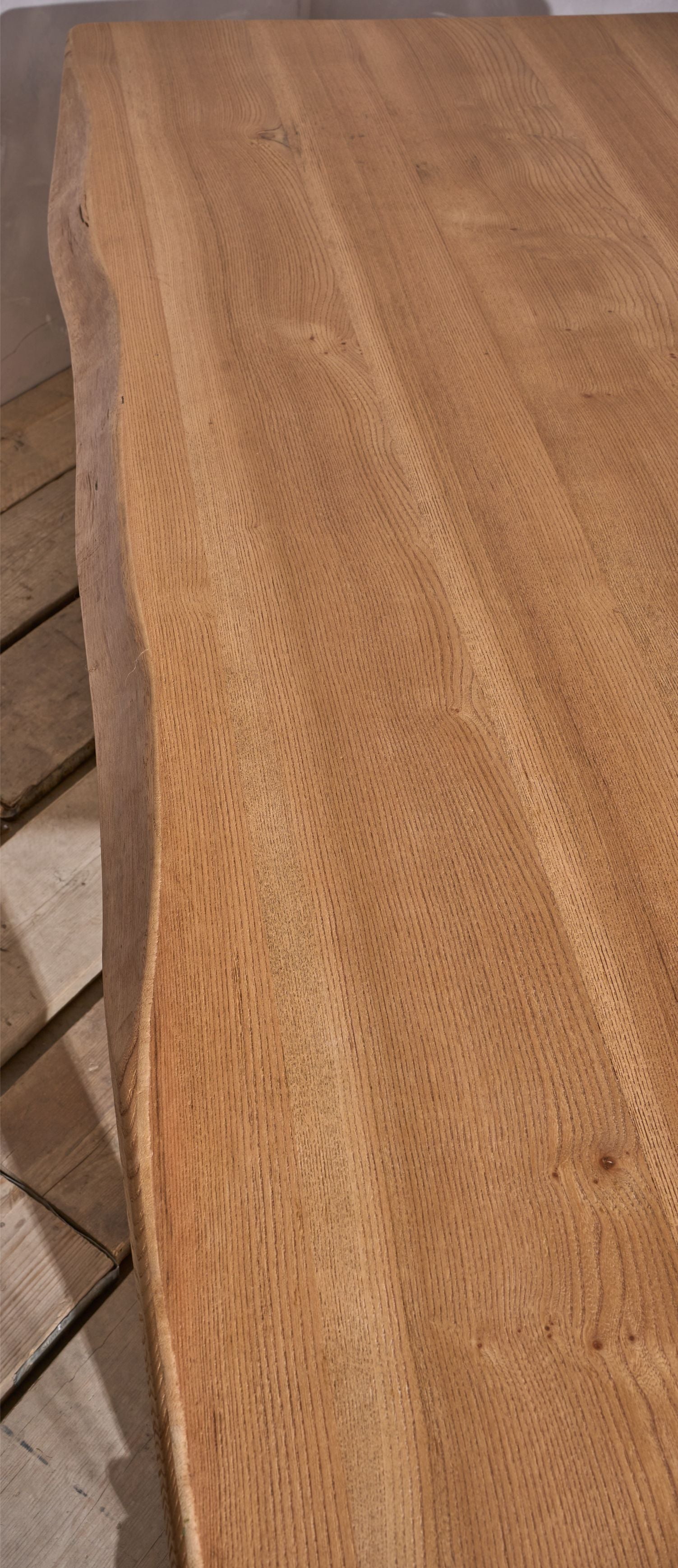 This is a very smart 20th century waney edged dining table made from elm. Wonderful figuring to the wood and naturalistic elements that make this hugely decorative. Finished in a clear oil to help protect the wood from everyday life