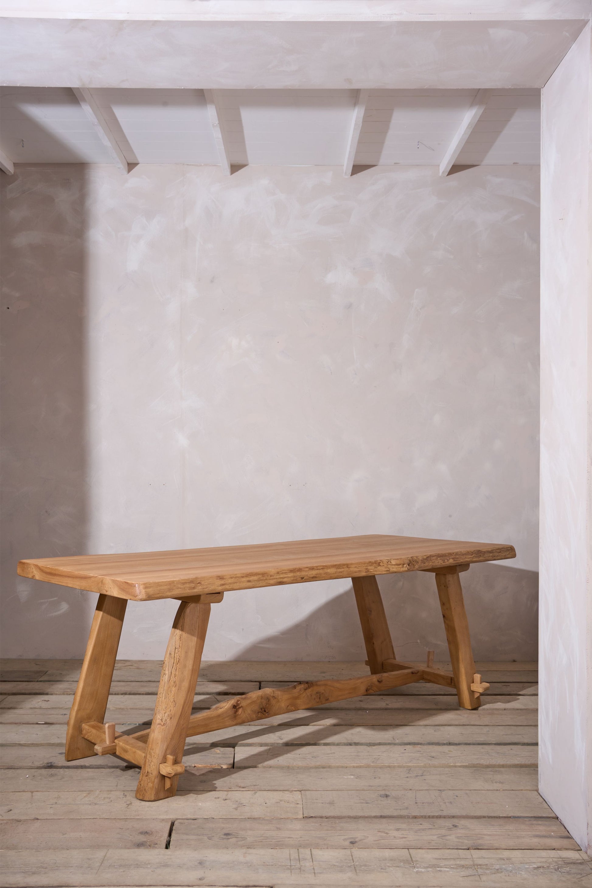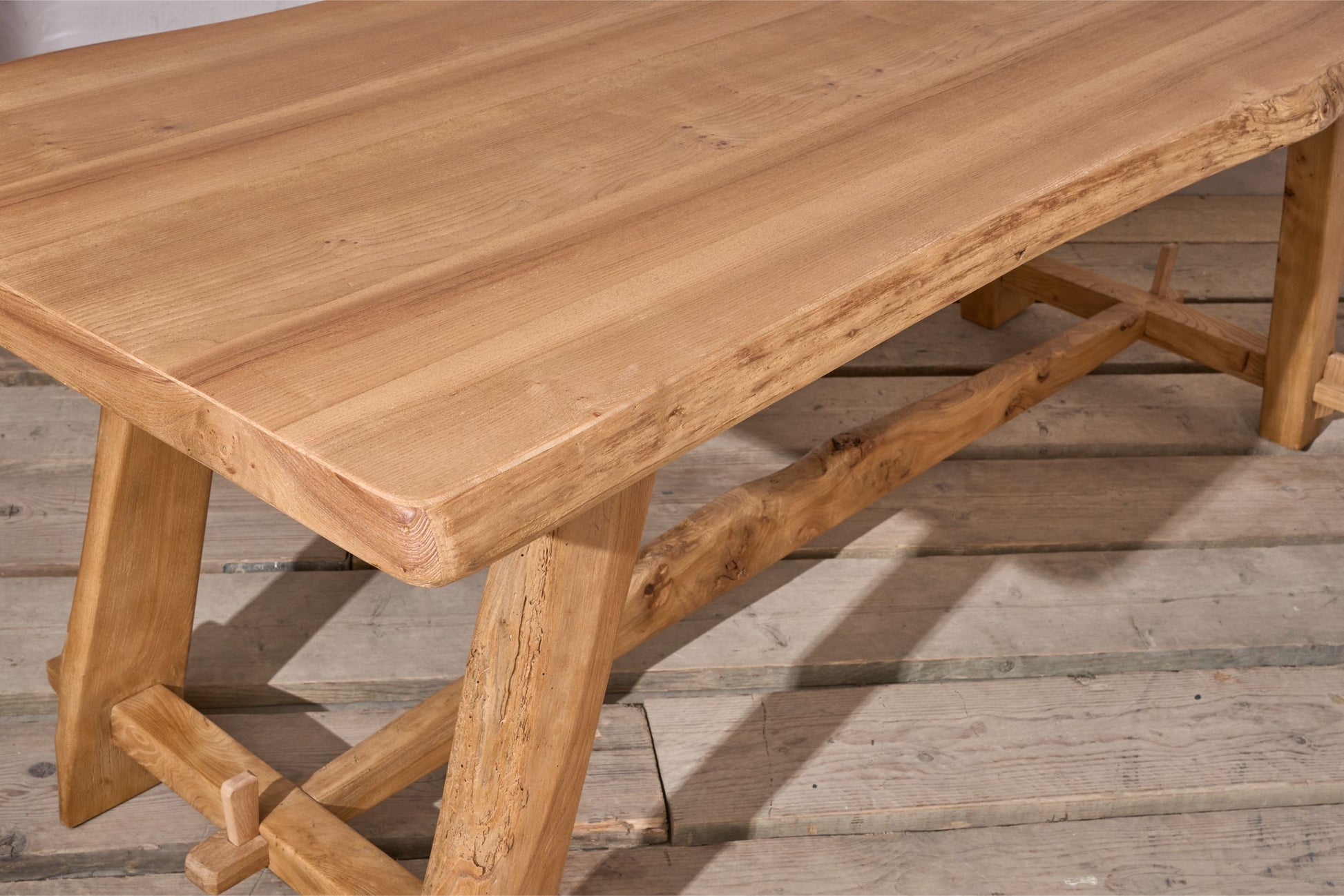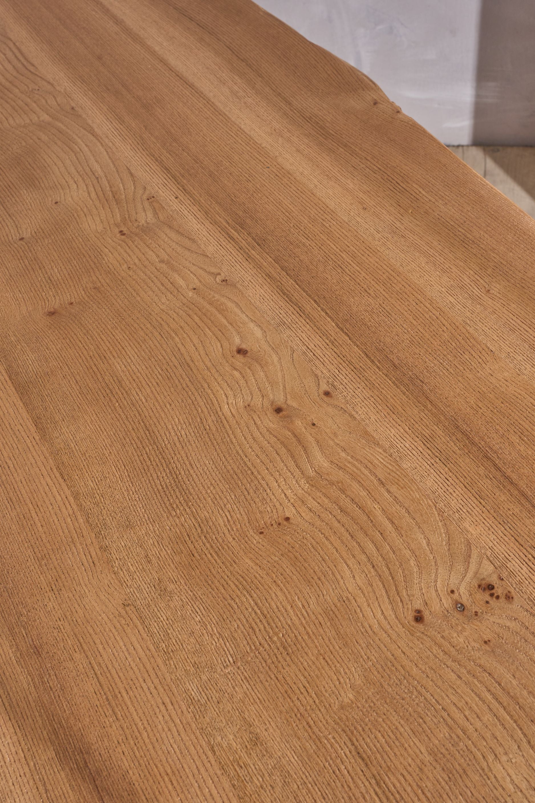 This is a very smart 20th century waney edged dining table made from elm. Wonderful figuring to the wood and naturalistic elements that make this hugely decorative. Finished in a clear oil to help protect the wood from everyday life